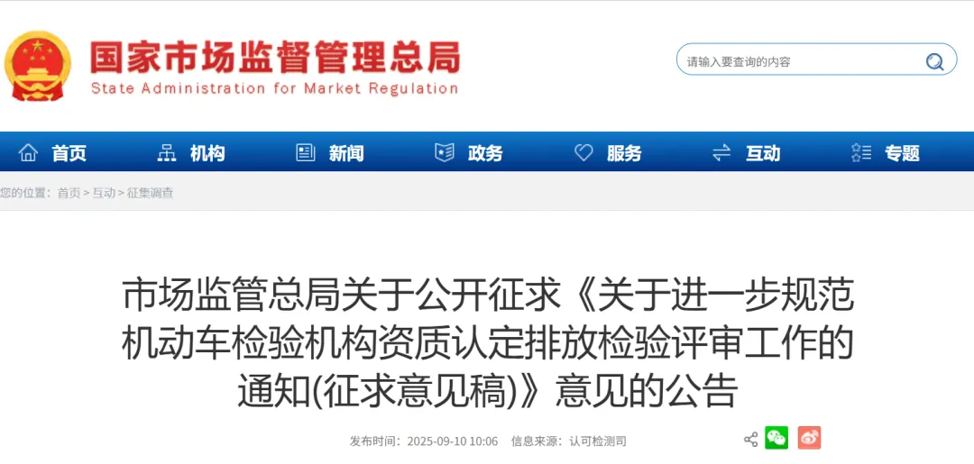 市场监管总局就《关于进一步规范机动车检验机构资质认定排放检验评审工作的通知(征求意见稿)》公开征求意见​